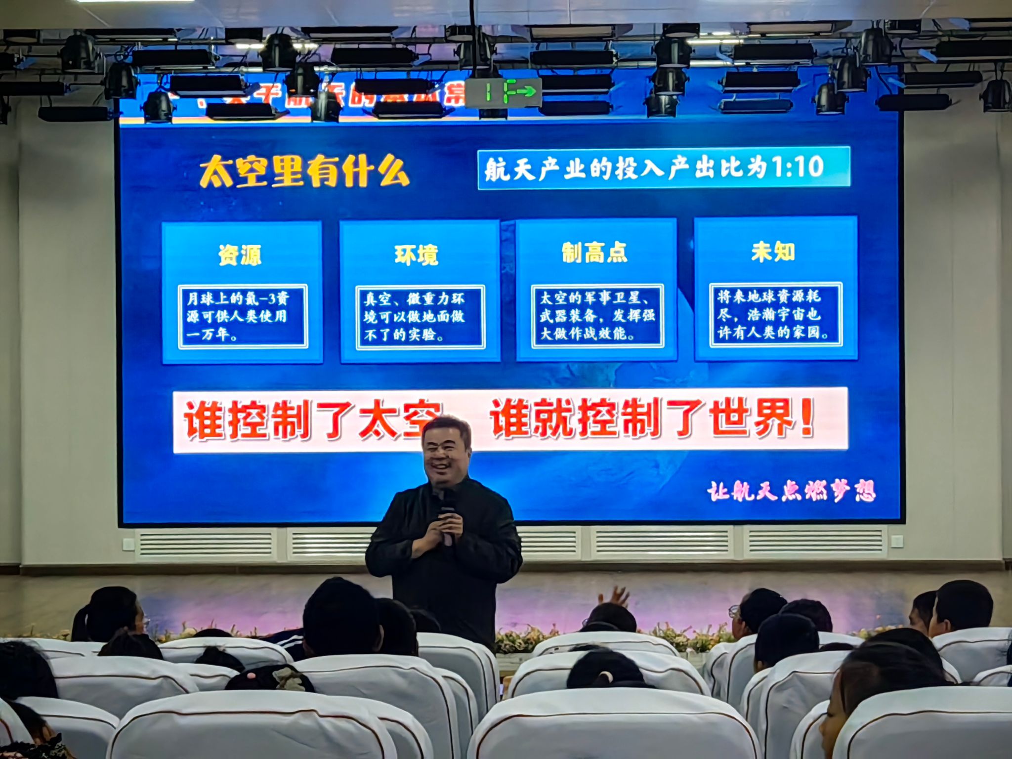 本次讲座以“航天点燃梦想”为题,侯冀老师以五段精心设计的篇章为内容,引领师生穿梭于浩瀚星海。他从“关于航天的基本常识”的基础科普,到“人类的航天梦想与实践”的历史追溯,从“中国航天的发展历程与辉煌成就”的激情讲述,到“未来的中国航天”的前景展望,最后以“让航天点亮梦想”的励志分享收尾,完整呈现中国航天波澜壮阔的发展画卷。