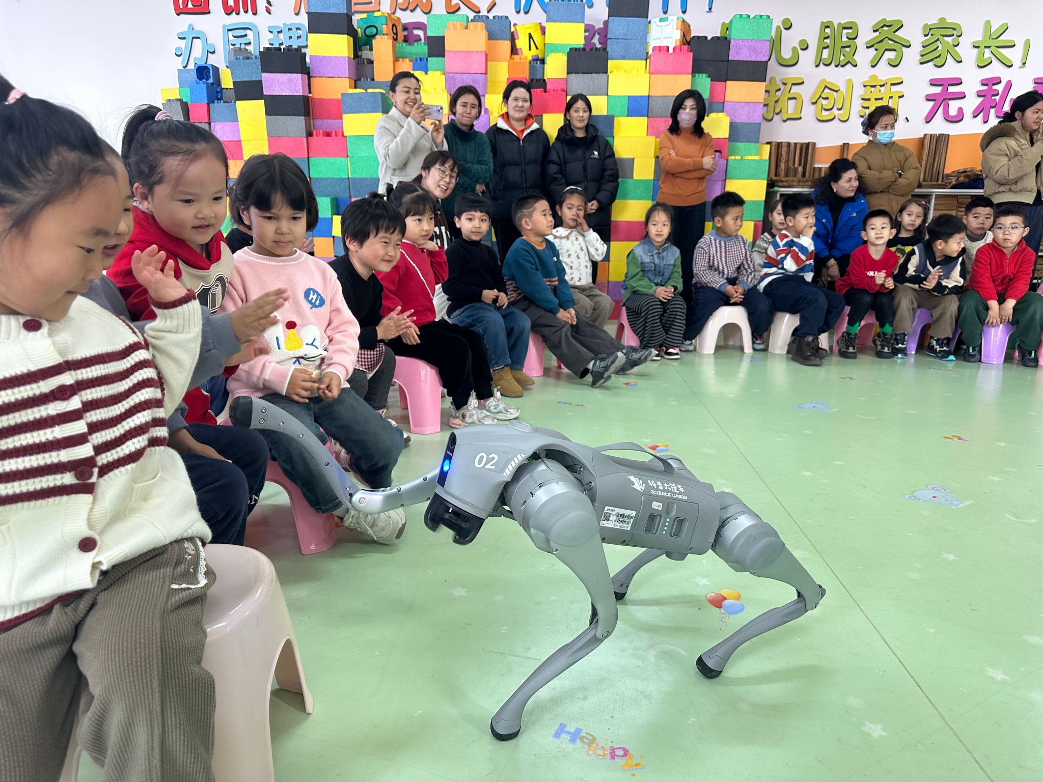 活动现场化身为一个微型的“科技乐园”。憨态可掬的机器人随着音乐节奏灵活起舞,引得孩子们阵阵惊呼与掌声;反应敏捷、动作矫健的机器狗表演了行走、翻滚等技能,牢牢吸引住孩子们的目光,大家目不转睛,充满了好奇。在老师的引导和帮助下,孩子们还亲身体验了各种益智展具和VR眼镜。通过亲手操作和沉浸式观看,抽象的科技知识变得直观可感,神奇的虚拟世界近在眼前,让孩子们兴奋不已,纷纷排队等待体验。
