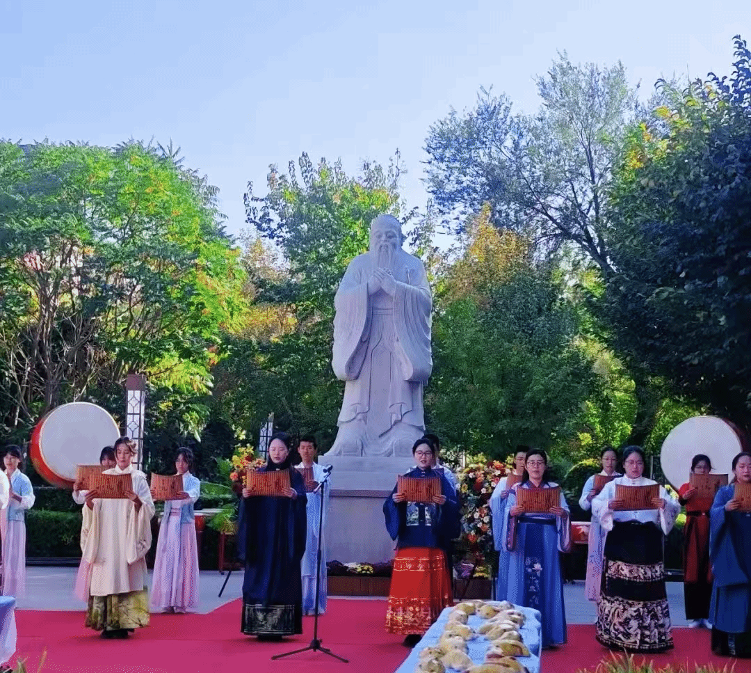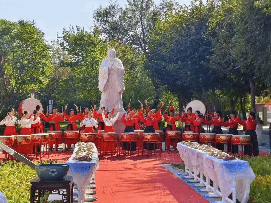 在昌吉市第一中学的孔子诞辰纪念活动中,鼓舞表演以《象王行》为律,通过节奏与队形的变化呈现“门扉开启”的视觉意象,隐喻“知识之门”的打开。主祭官及师生代表行净手、整衣、献花之礼,以庄重仪式传递对先贤的敬意,同时也体现了行为心理学中“仪式感”对集体认同的强化作用。诵读《论语》《大学》等经典篇章,不仅展现语言韵律之美,更暗合认知科学中“韵律记忆”对知识长期留存的有效性。