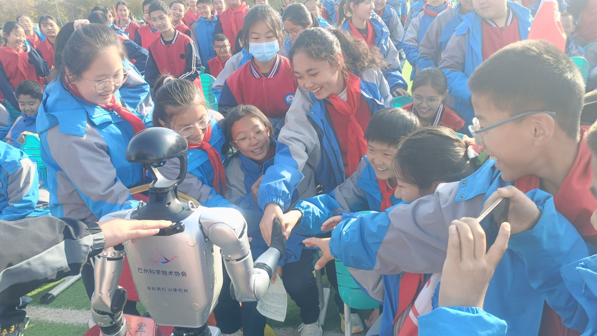 智能机器人与机器狗的表演更是将现场气氛推向了高潮,人形机器人流畅完成奔跑、挥手打招呼、握手等动作,传递科普惠民的温度;机器狗迈着稳健步伐穿梭在人群中,不时做出“比心”“握手”等互动动作,引来学生们阵阵欢笑与掌声。大家纷纷围拢在一起,近距离触摸、观察,与这些科技“伙伴”展开一场生动对话。