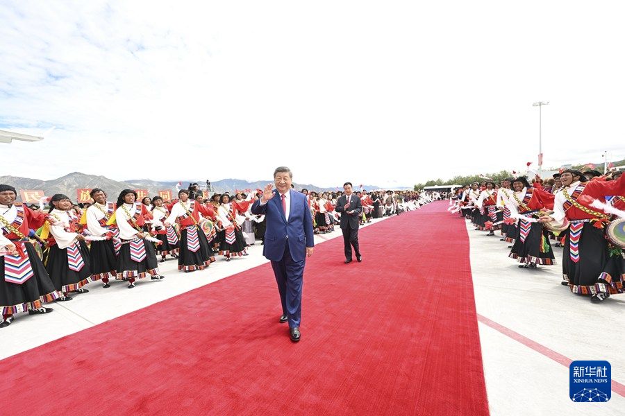 习近平离开西藏时,各族群众纷纷来到拉萨市区的沿途道路两旁,挥舞红旗、手捧哈达,欢呼着向总书记问好,向总书记表达由衷的爱戴。拉萨贡嘎机场,身着节日盛装的干部群众挥舞着红旗和花束,载歌载舞,高喊“扎西德勒”,表达高原儿女对以习近平同志为核心的党中央的感激之情、对建设社会主义现代化新西藏的坚定信心。