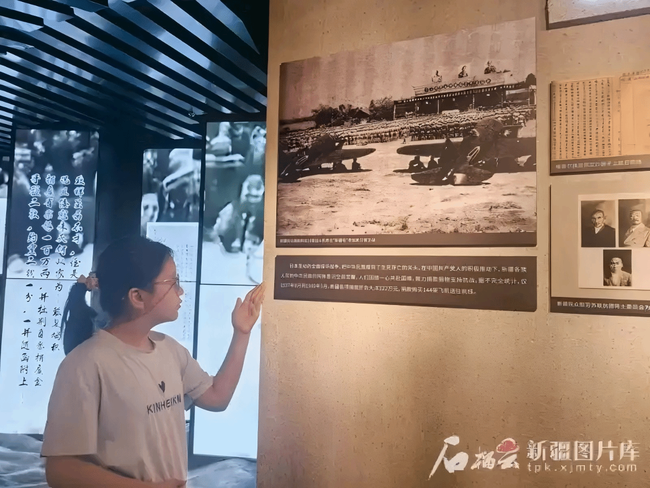 图为五年级小讲解员穆合丽沙·阿不都热依木在乌鲁木齐市的八路军驻新疆办事处纪念馆的展厅里,向参观者讲解献机运动。石榴云/新疆日报记者宋雅文摄