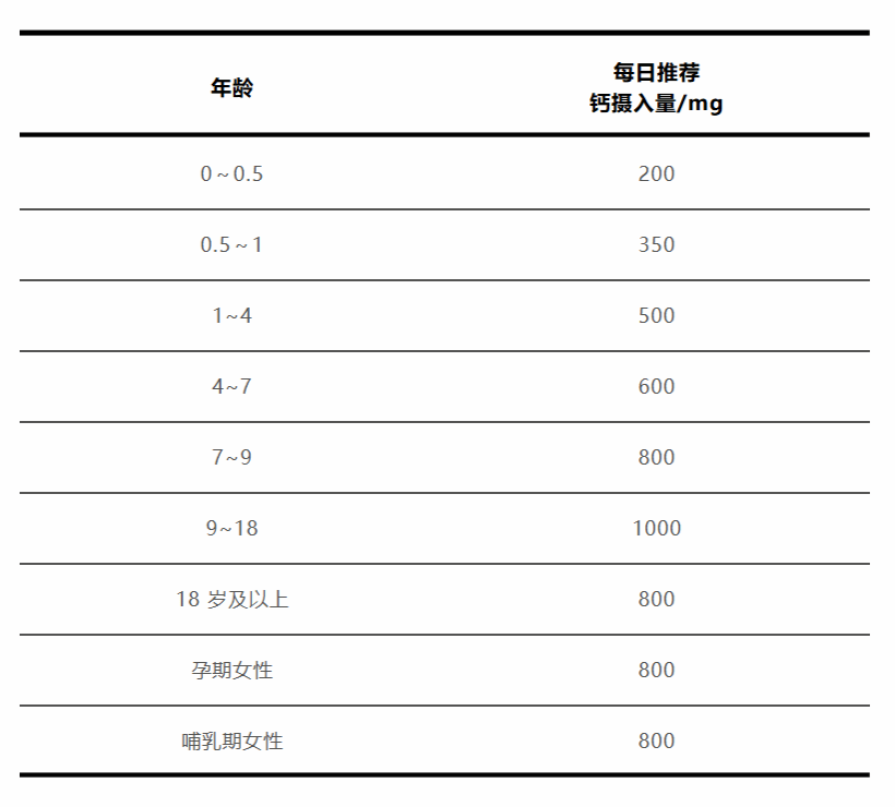 根据《中国居民膳食营养素参考摄入量(2023)》的建议,普通成人及孕妇、乳母的每日推荐钙摄入量为 800 mg;9~18 岁青少年的每日推荐钙摄入量则是 1000 mg。