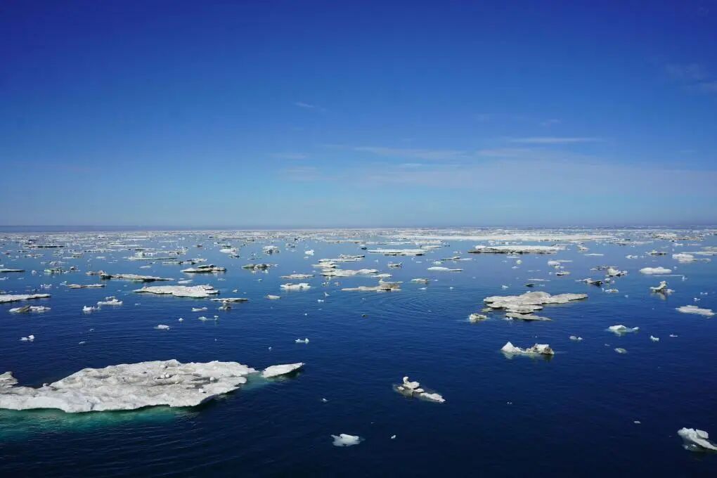 这是2023年7月25日从“雪龙2”号极地科考破冰船拍摄的北极圈内的浮冰。新华社记者 魏弘毅 摄