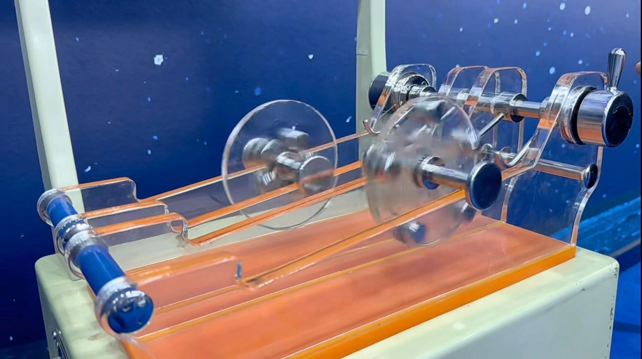 科学无止境,探索永不停。同学们大家好,欢迎来到今天的探秘小课堂。花样滑冰比赛啊一直都是备受大家喜爱的体育项目之一,花滑选手在冰上犹如精灵一般旋转飘逸,那同学们有没有想过,为什么花滑选手可以自如地控制旋转速度呢?那就让我们从今天要讲解的这件展项《看谁跑得快》中寻找答案。