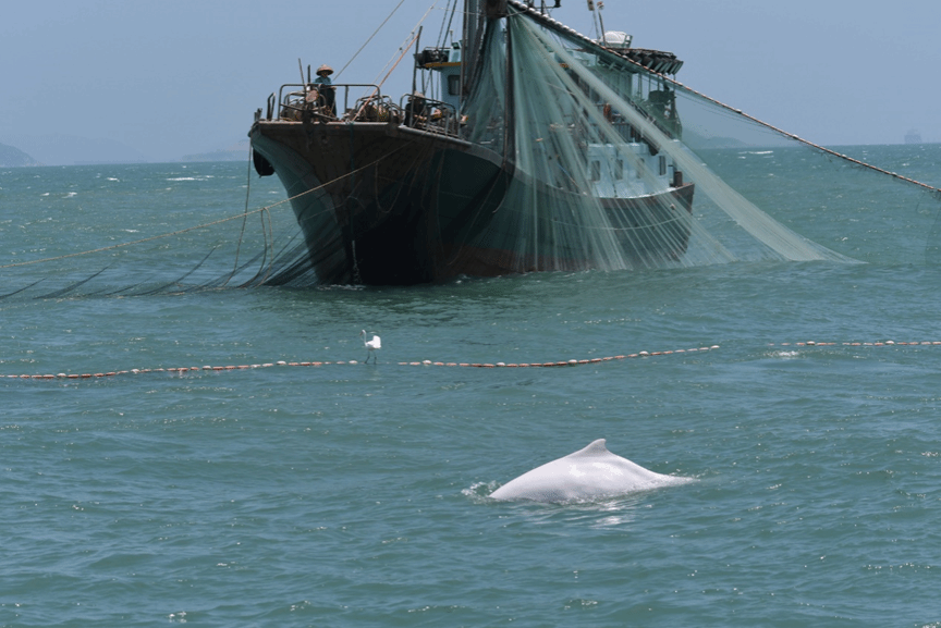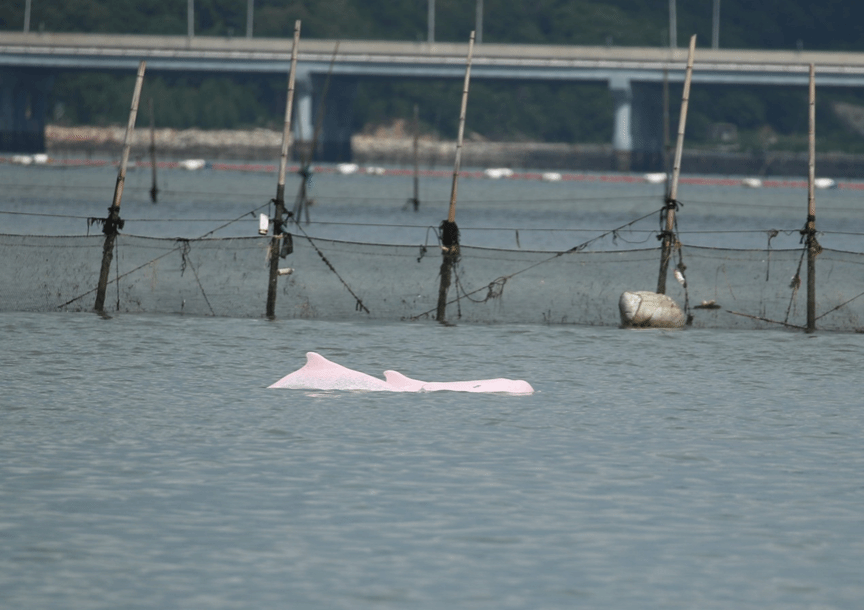 游弋在渔网旁的中华白海豚,酷渔滥捕不仅影响中华白海豚食物来源,废弃渔网缠绕或误捕也会给中华白海豚产生直接伤害,拍摄者gomenwl@ inaturalist