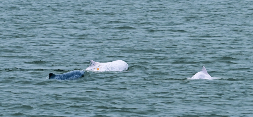 三头中华白海豚体色的差异表明它们处于不同的生命周期(图片来源:作者提供)