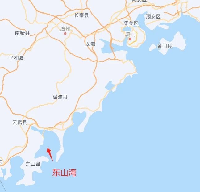 东山湾全貌,由于剧烈的人类活动挤压,目前东山湾内的2头中华白海豚大部分时间仅能在白色虚线部分内辗转(图片来源:@天地图)